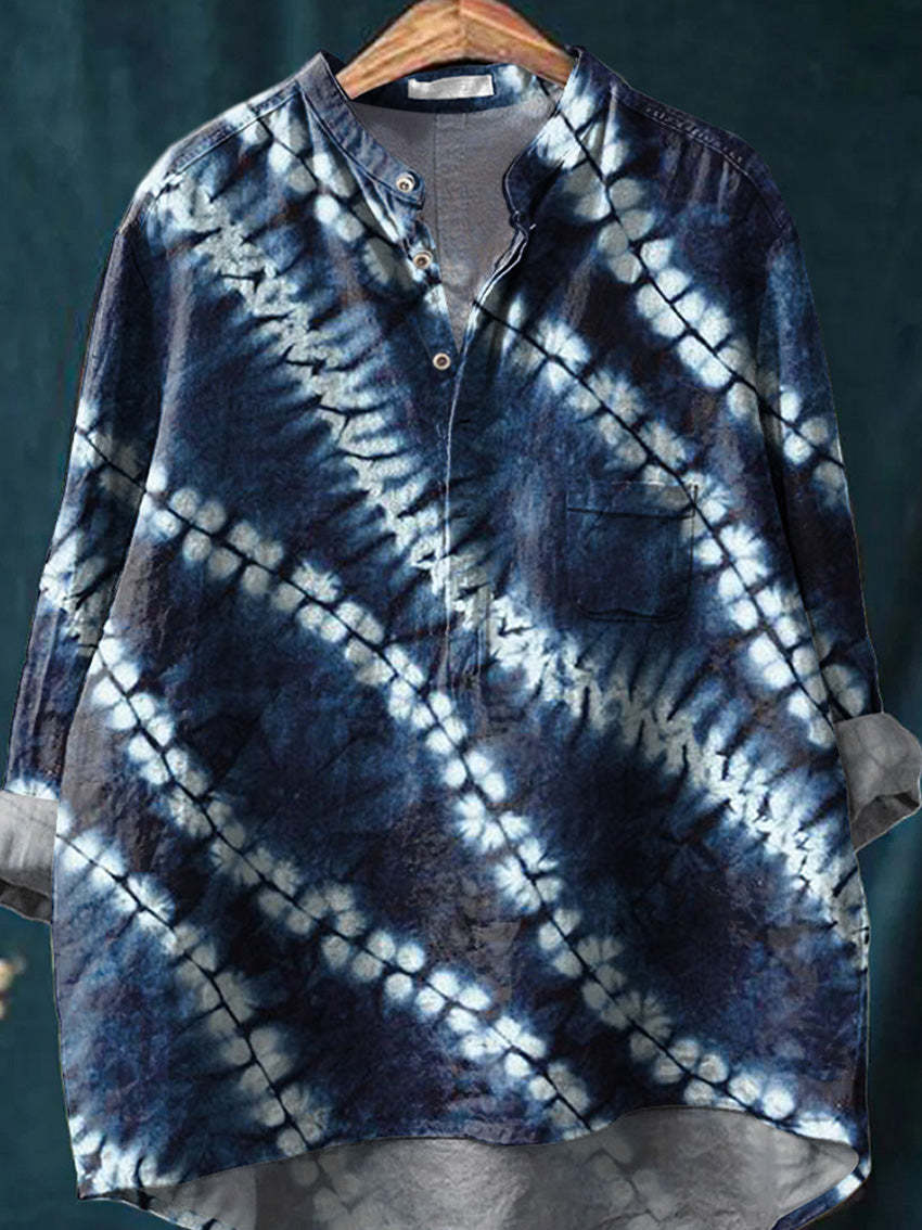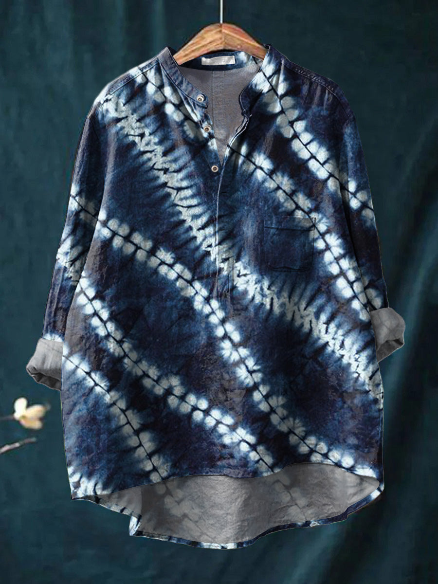 Abstract Shibori Tie Dye Pattern Printed Women's Casual Long Sleeve Comfortable Cotton Shirt