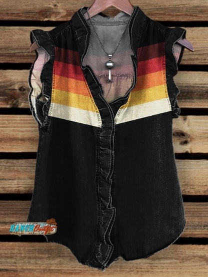 Black Women's White and Red Stripes Print Ruffle Front Tank Top
