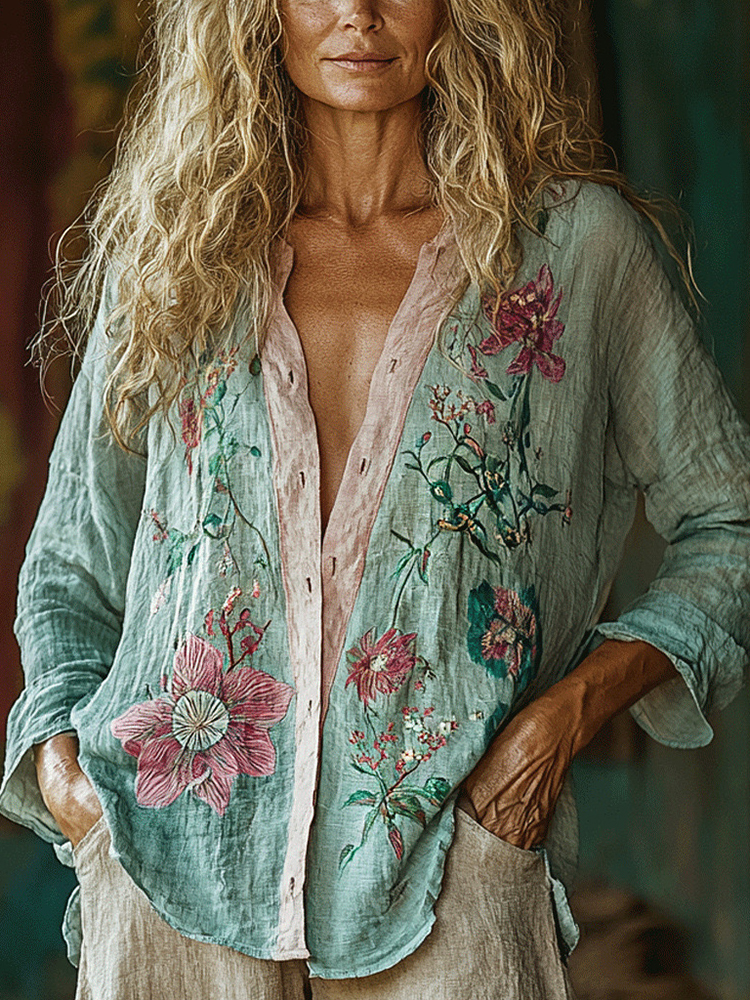 Bohemian Style Linen Floral Print Long Sleeve Shirt