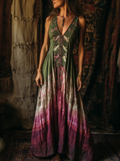 Bohemian Style Plant-dyed Knitted Flower-hollowed Sleeveless V-neck Long Dress