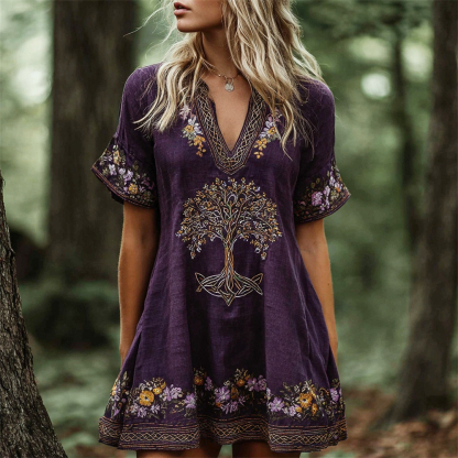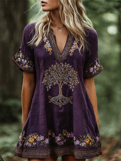 Boho Floral Tree Of Life Embroidery Women's Linen Short Sleeve V-neck Mini Dress