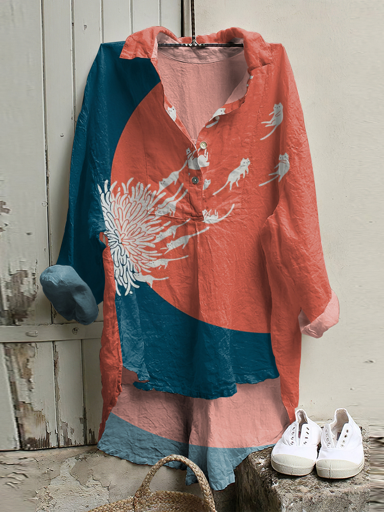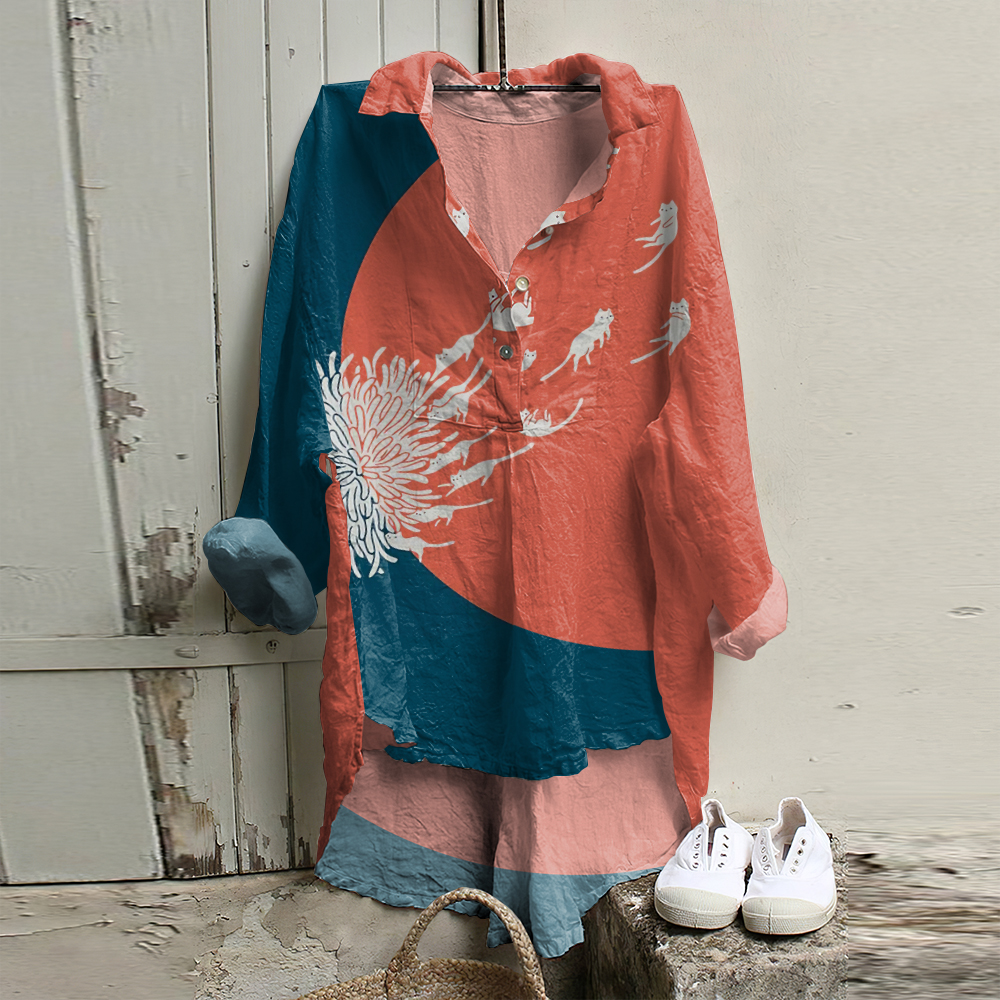 Casual Dandelion and Cat Printed Long Sleeve Tunic