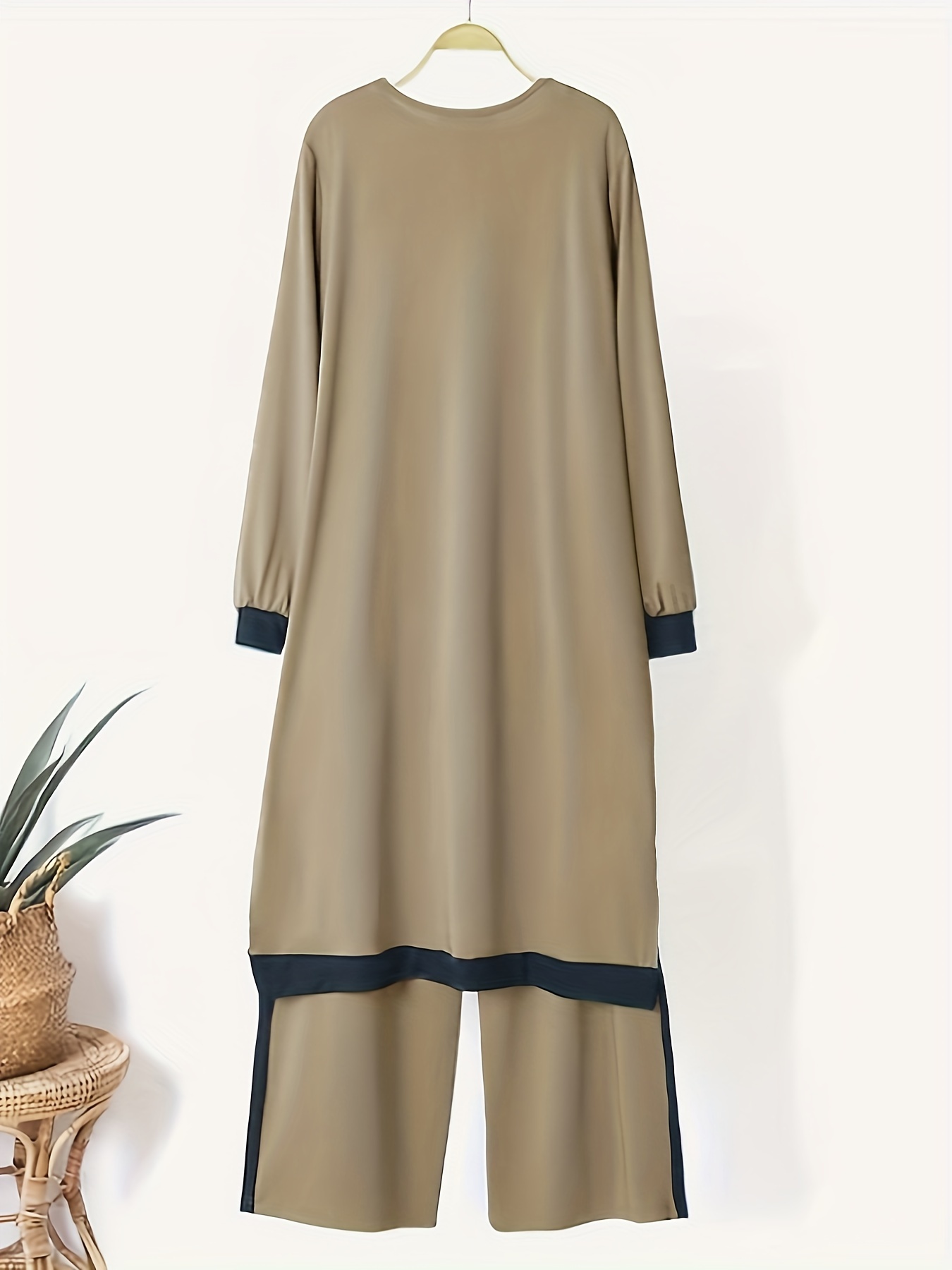 Color Block Casual Three-piece Set, Open Front Long Sleeve Cardigan & V Neck Tops & Wide Leg Pants Outfits, Women's Clothing