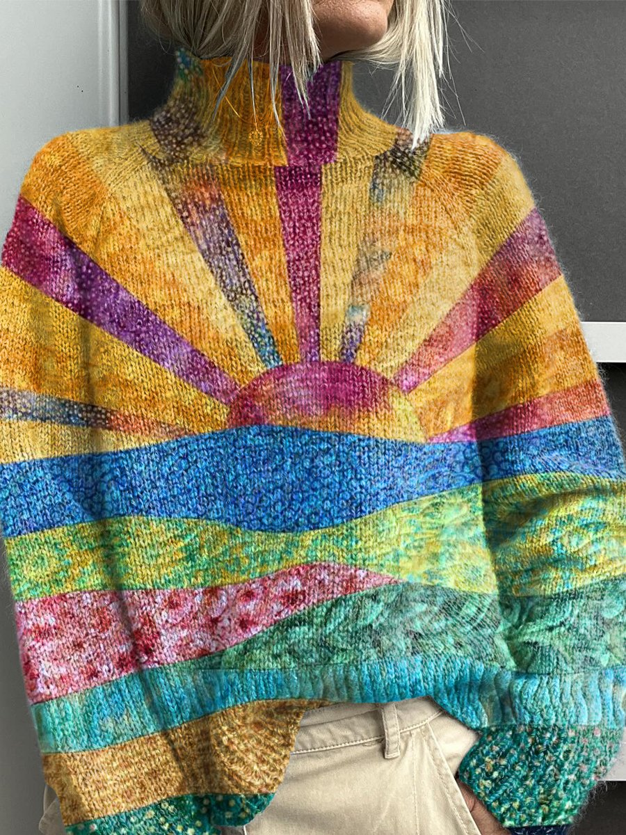 Color Collage Sun Art Painting Print Knit Turtleneck Pullover Sweater