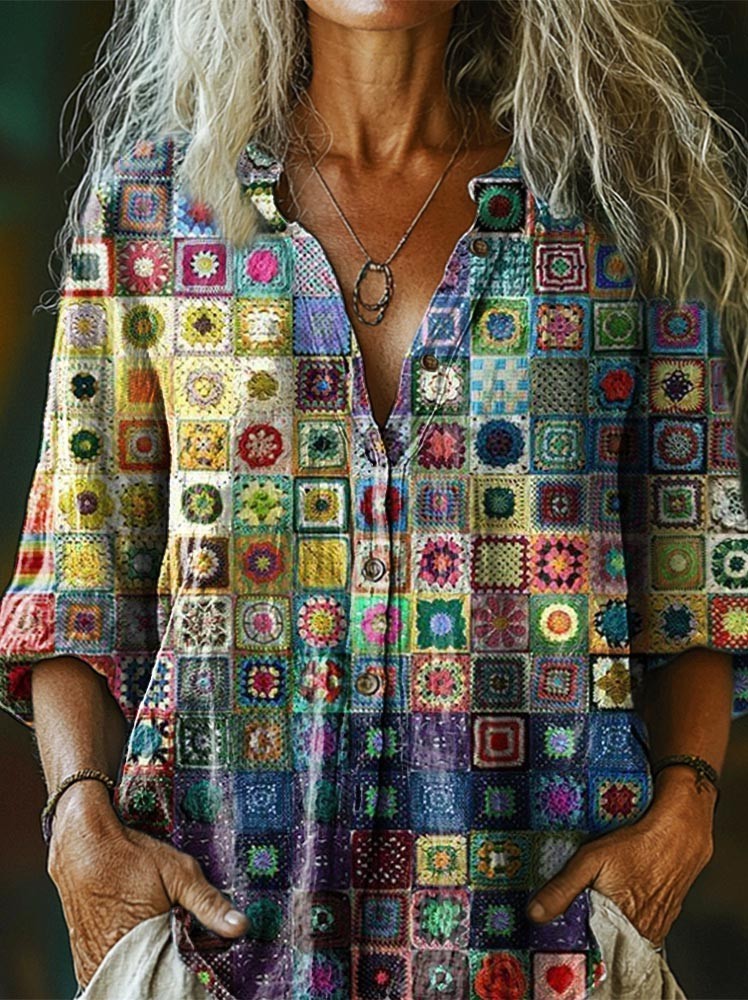 Colorful Geometric Check patterns Women's Print Casual Cotton Linen Shirt