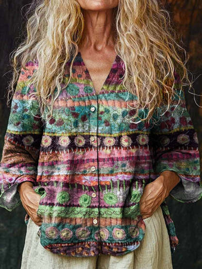 Countryside Style Patchwork Pattern Printed Women's Linen And Cotton V-Neck Casual Shirt