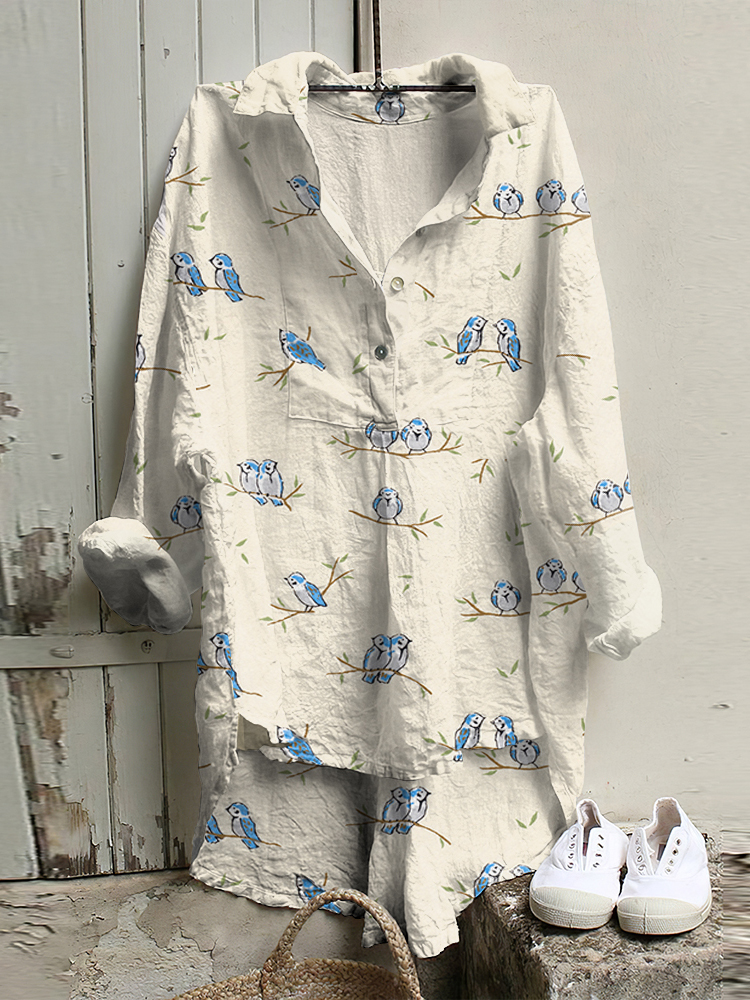 Cozy Bird Plant Art Cotton Blend Casual Long Sleeve Shirt