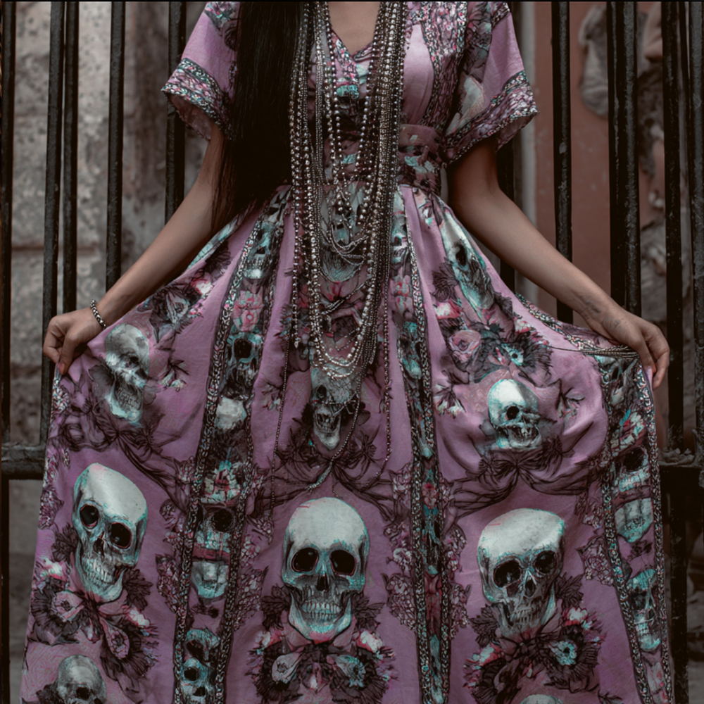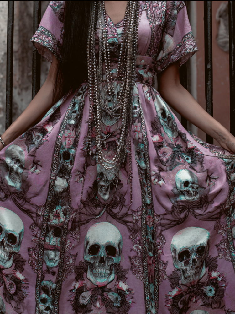 Day Of The Dead Skull Flower Print V-neck Retro Short Sleeve A-line Long Dress