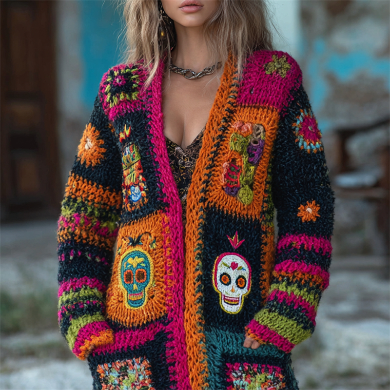 Day Of The Dead Sugar Skull Crochet Colorblock Cozy Knit Cardigan