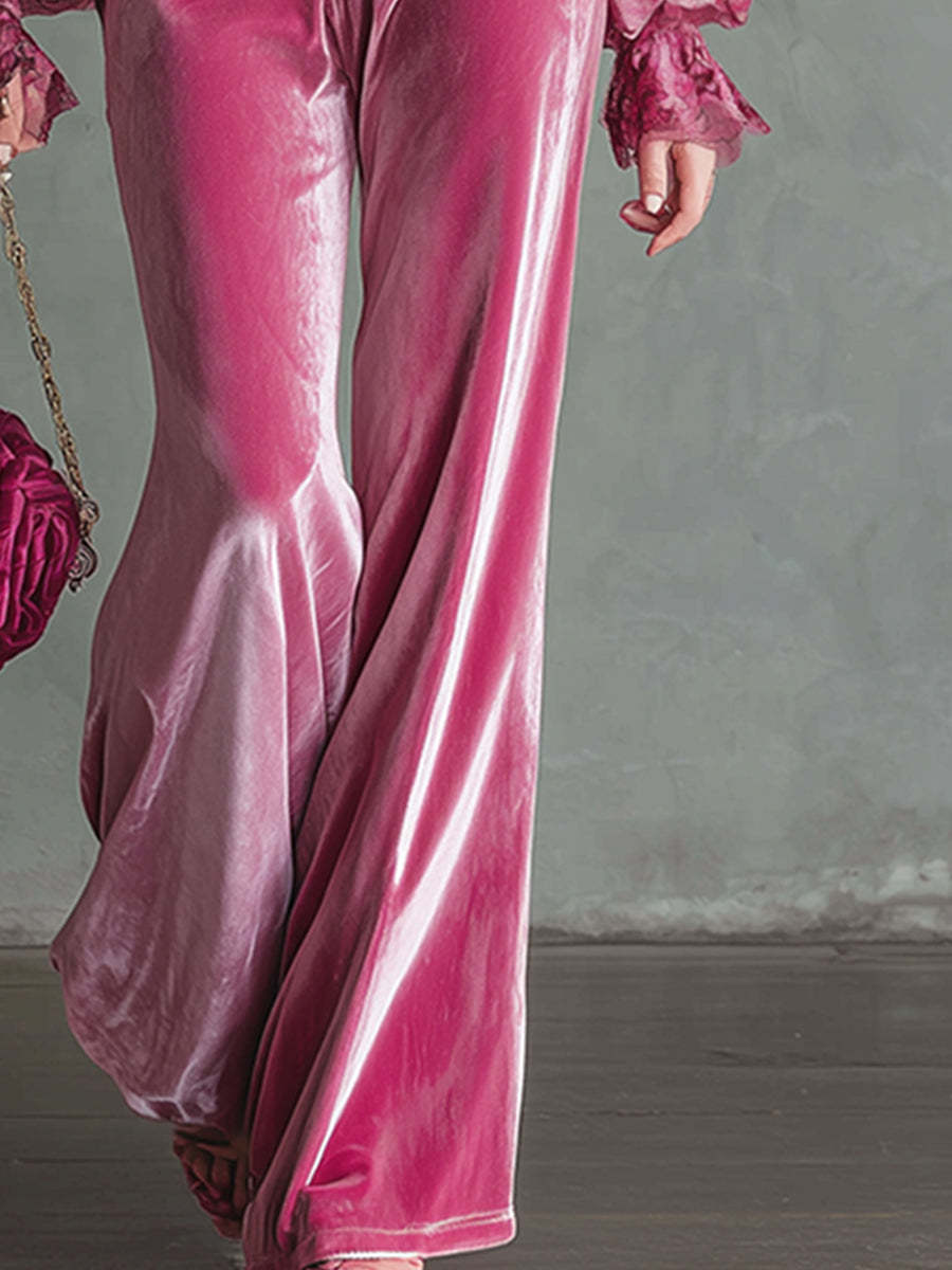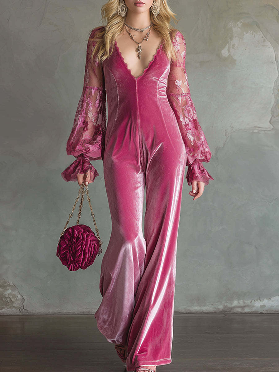 Elegant And Eye-catching Bright Pink Velvet Lace Long-sleeved Loose Jumpsuit
