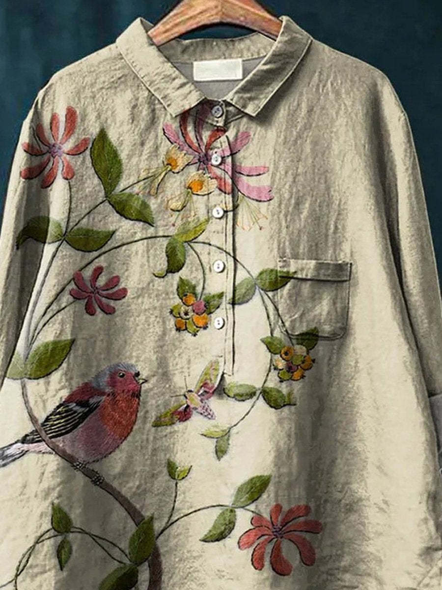 Embroidery Style Bird And Floral Graphic Printed Women's Casual Cotton And Linen Shirt