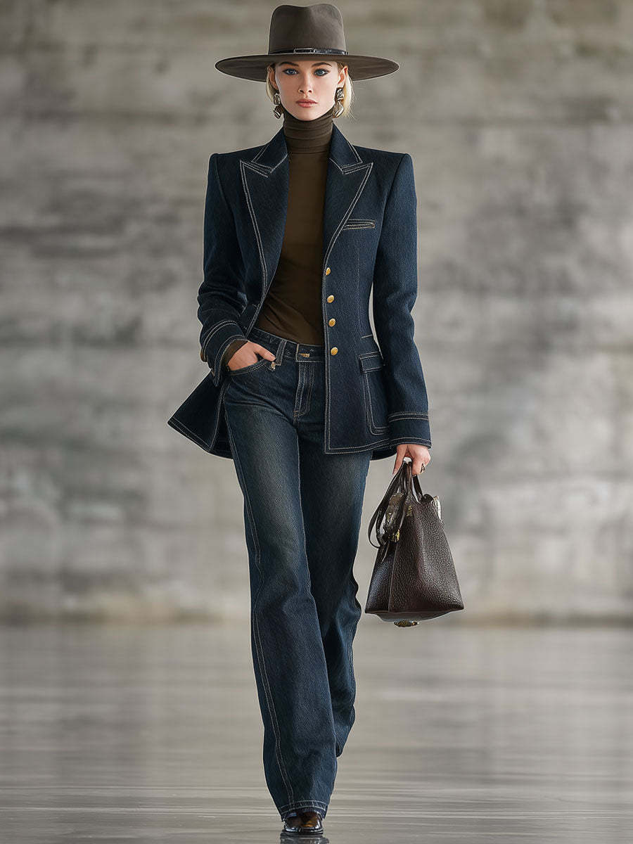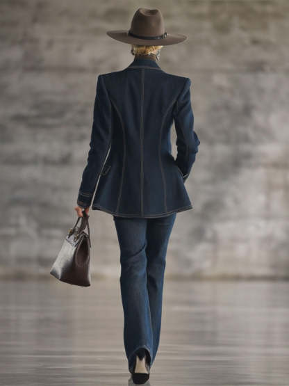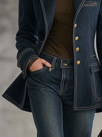 Fashion Retro Topstitched Navy Blue Denim Jacket