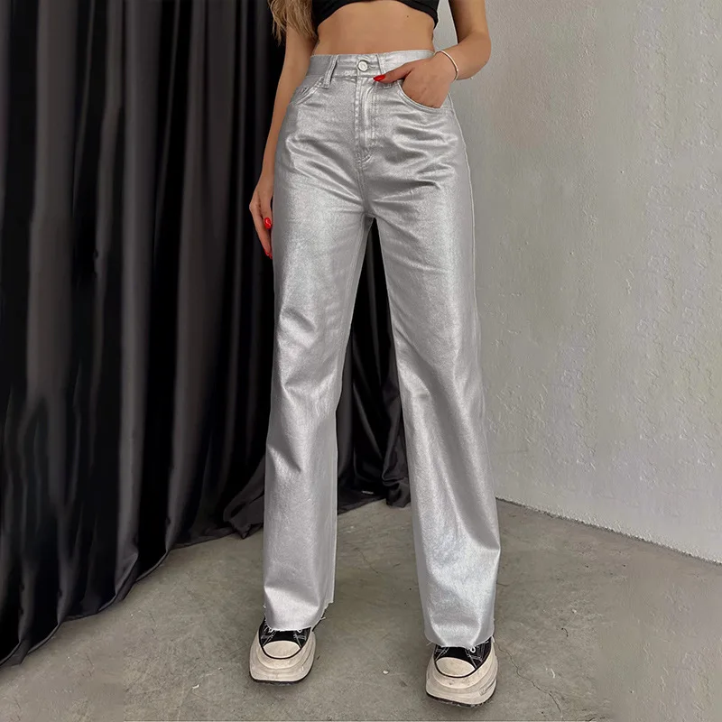 Fashion Silver High Waist Strap Pants Vintage Pockets Elegant Commuting Casual Loose Shiny Pants