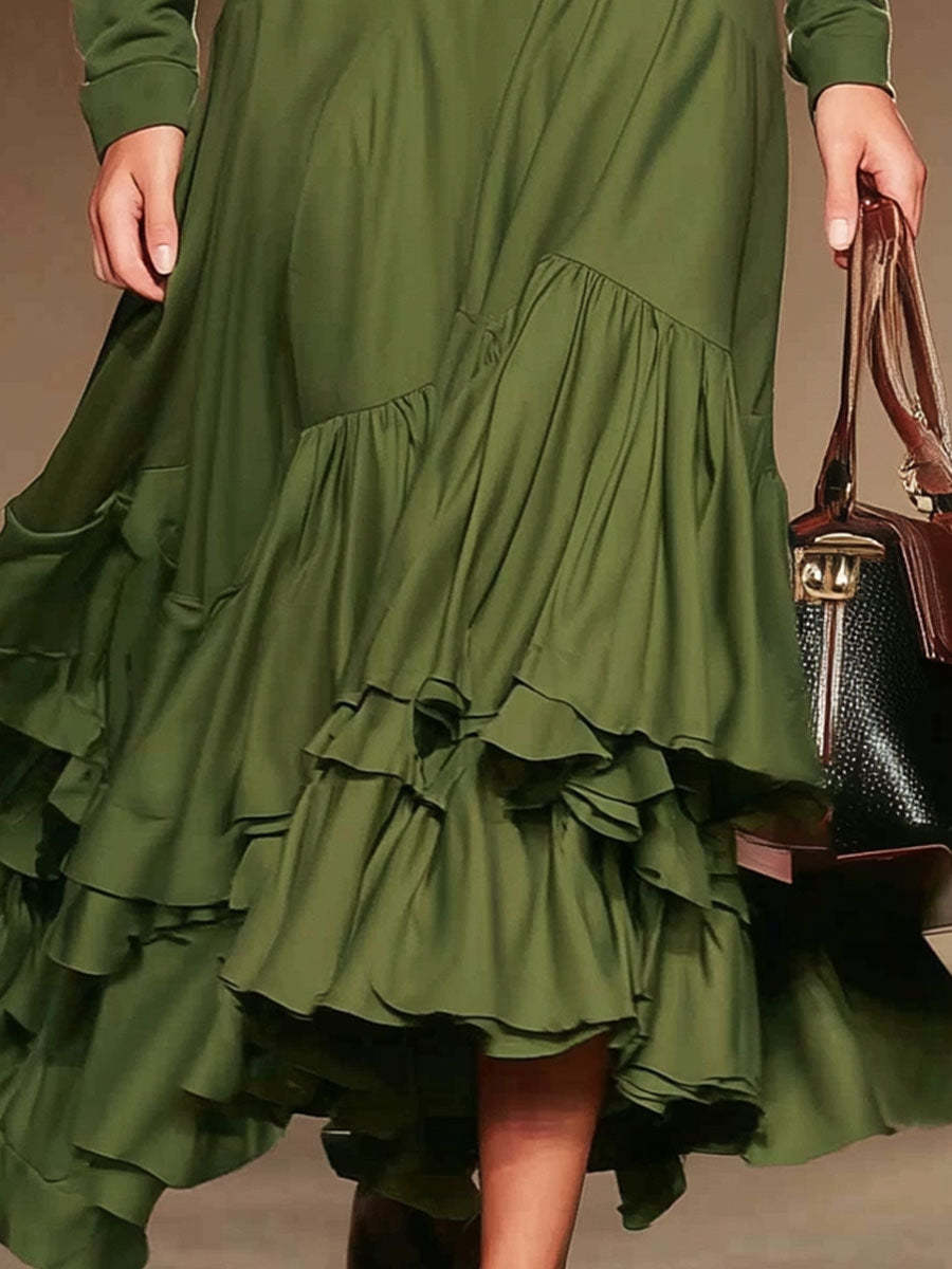 Paired with a coordinating top, this set creates a cohesive and chic look. The top might feature subtle design elements, such as puffed sleeves, a square neckline, or button details, that further underscore the retro aesthetic. Complement this ensemble with accessories like vintage-inspired earrings or a classic headband to enhance its nostalgic charm. For footwear, consider strappy sandals or classic pumps to complete the outfit, while a simple clutch or handbag can add a polished touch. Whether you're attending a garden party or a daytime event, this ruffled green skirt set offers a stylish nod to the past while embodying a fresh and fashionable spirit.