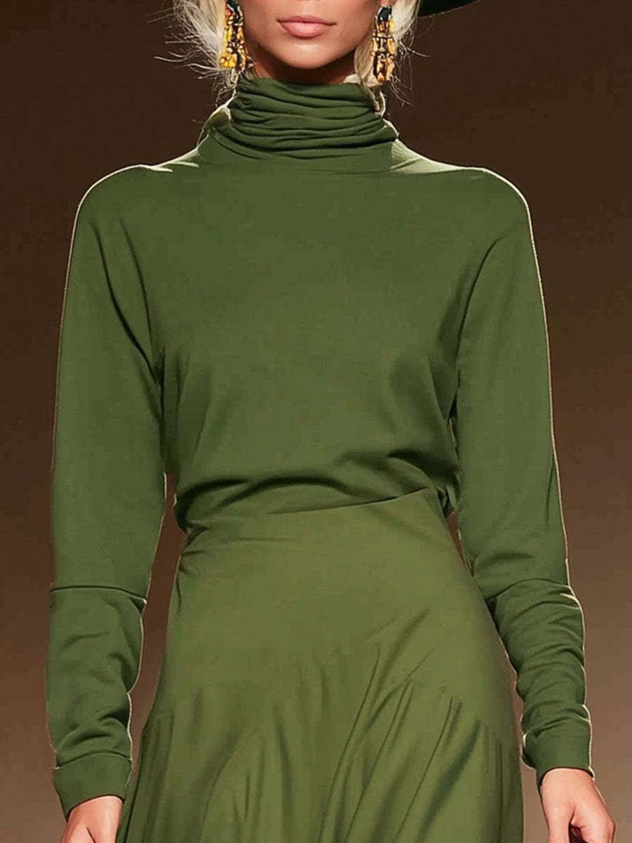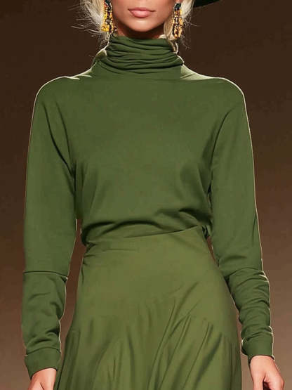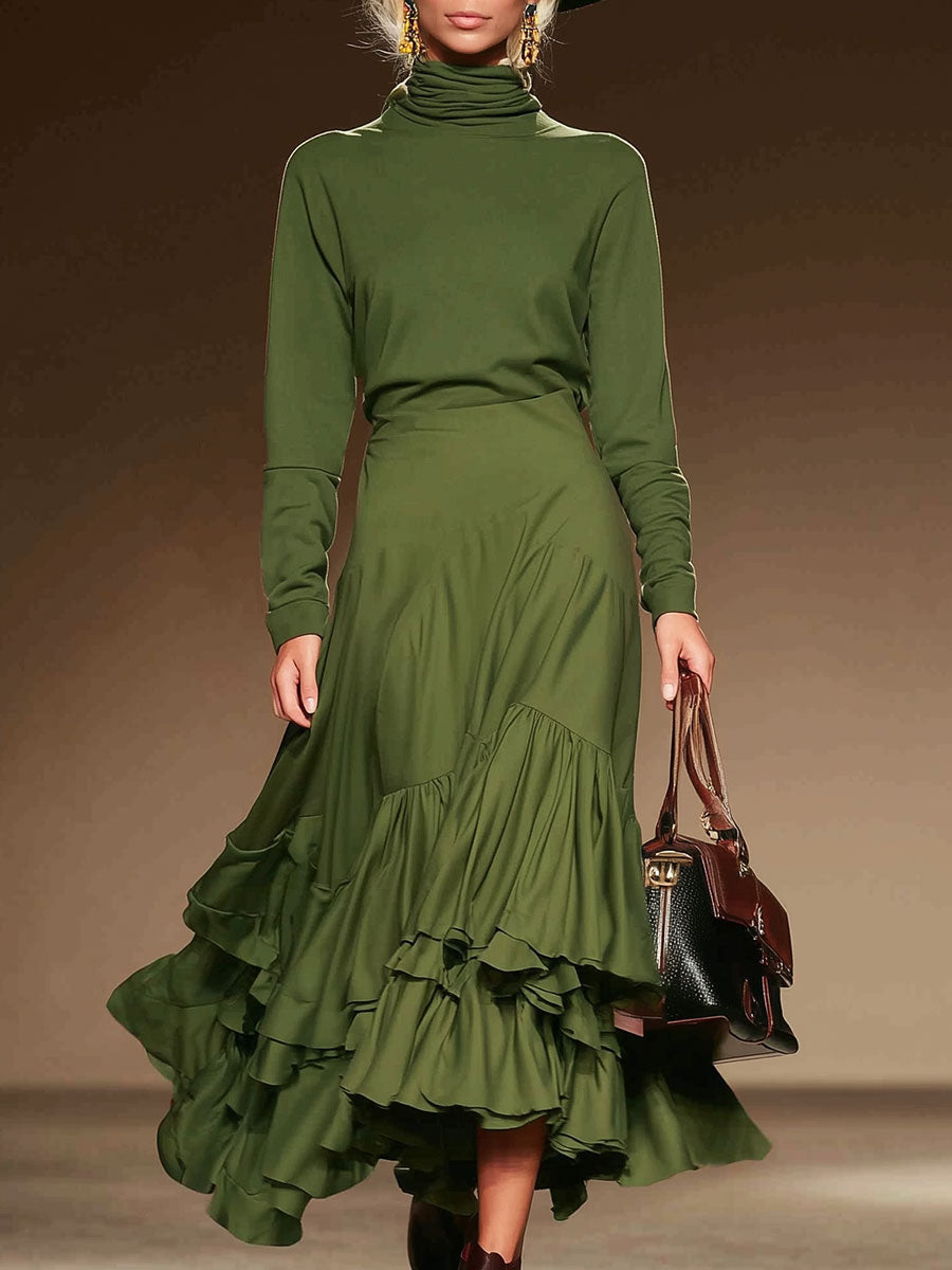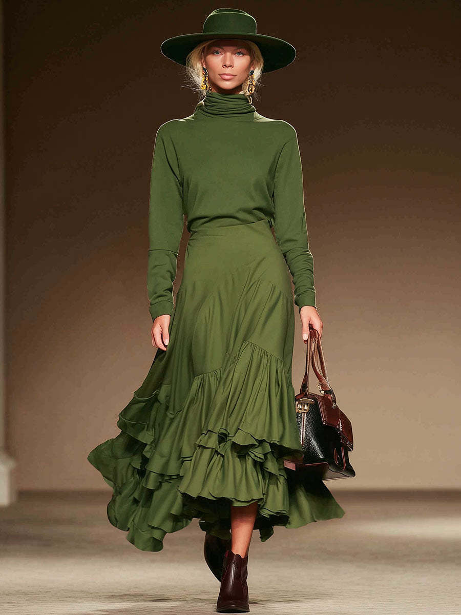 A fashionable retro ruffled green skirt set is a charming homage to vintage style with a modern twist. The skirt, often crafted from breathable fabrics like cotton or lightweight wool, typically features layers of ruffles that add movement and a playful touch to the ensemble. This textured element not only enhances the skirt's feminine appeal but also pays tribute to retro fashion sensibilities. The rich green hue serves as a versatile base, allowing the set to be both eye-catching and adaptable for various occasions.