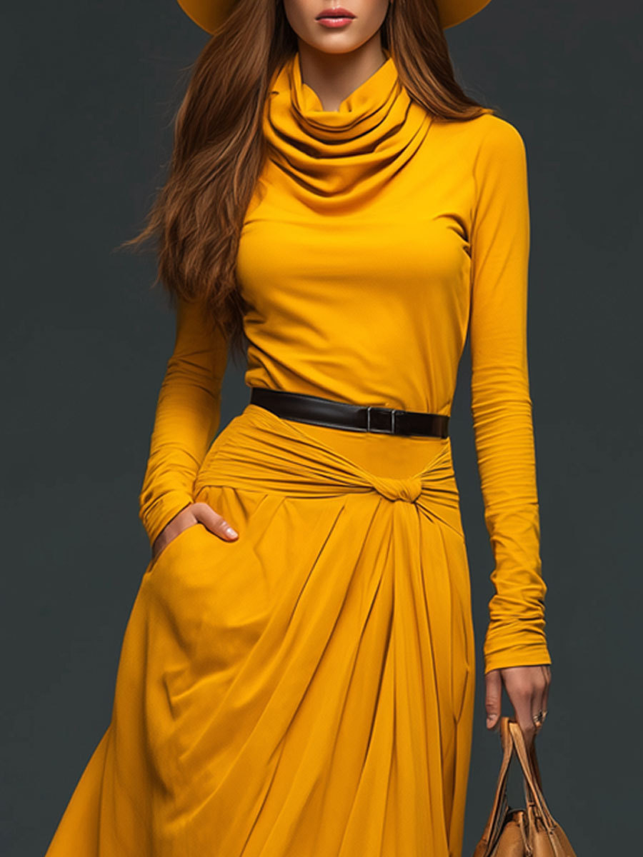 2.Design: Turtleneck, pleats, irregular hem, long sleeves, belt.
