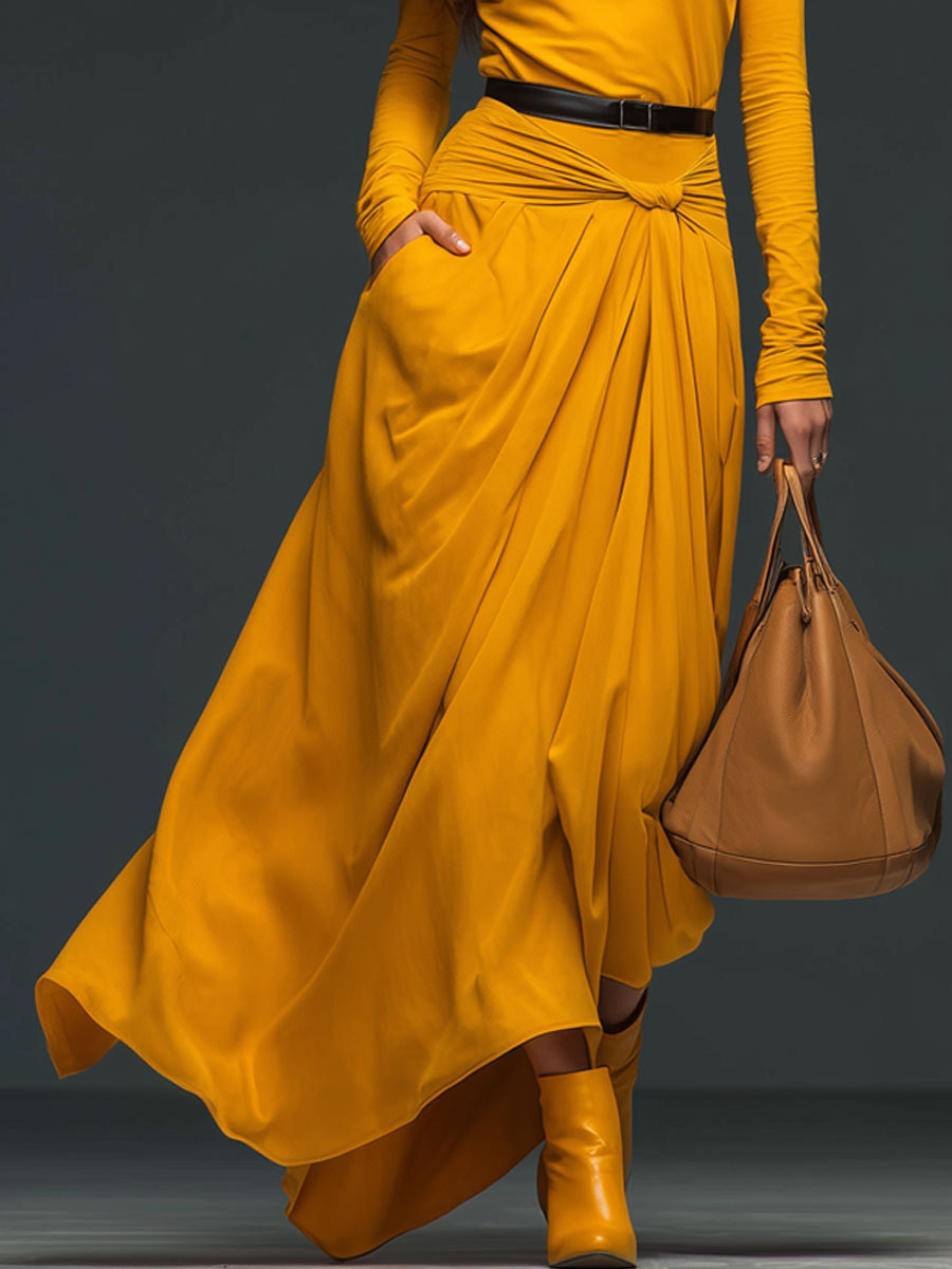 The fashionable retro yellow cotton pleated long-sleeved maxi dress is a stunning piece that effortlessly combines vintage-inspired design with contemporary style. The vibrant yellow hue of the cotton fabric brings a lively and cheerful energy to the dress, making it an ideal choice for those who want to stand out. Cotton, known for its comfort and breathability, ensures that the dress is as practical as it is stylish, making it suitable for a variety of occasions.