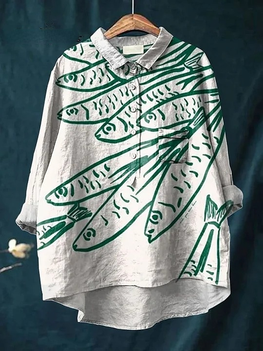 Fish Art Print Casual Cotton And Linen Shirt