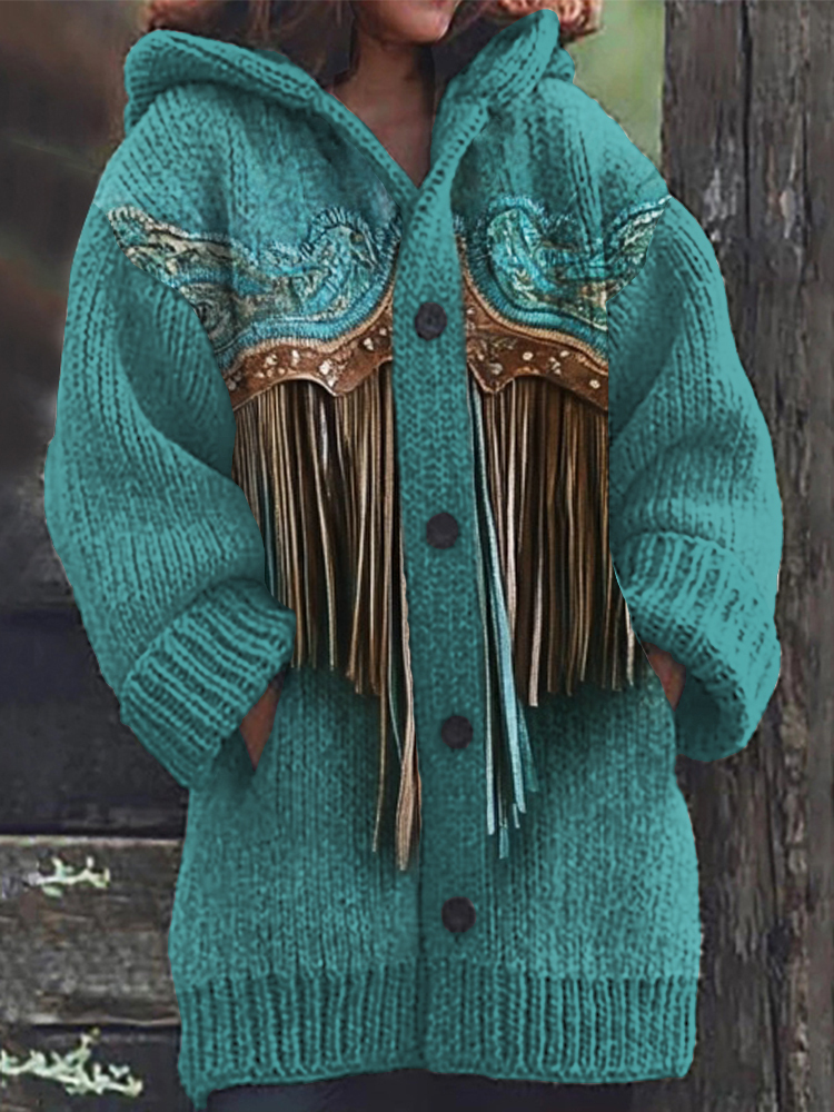 Floral Embroidered Turquoise Tassels Knit Hooded Cardigan