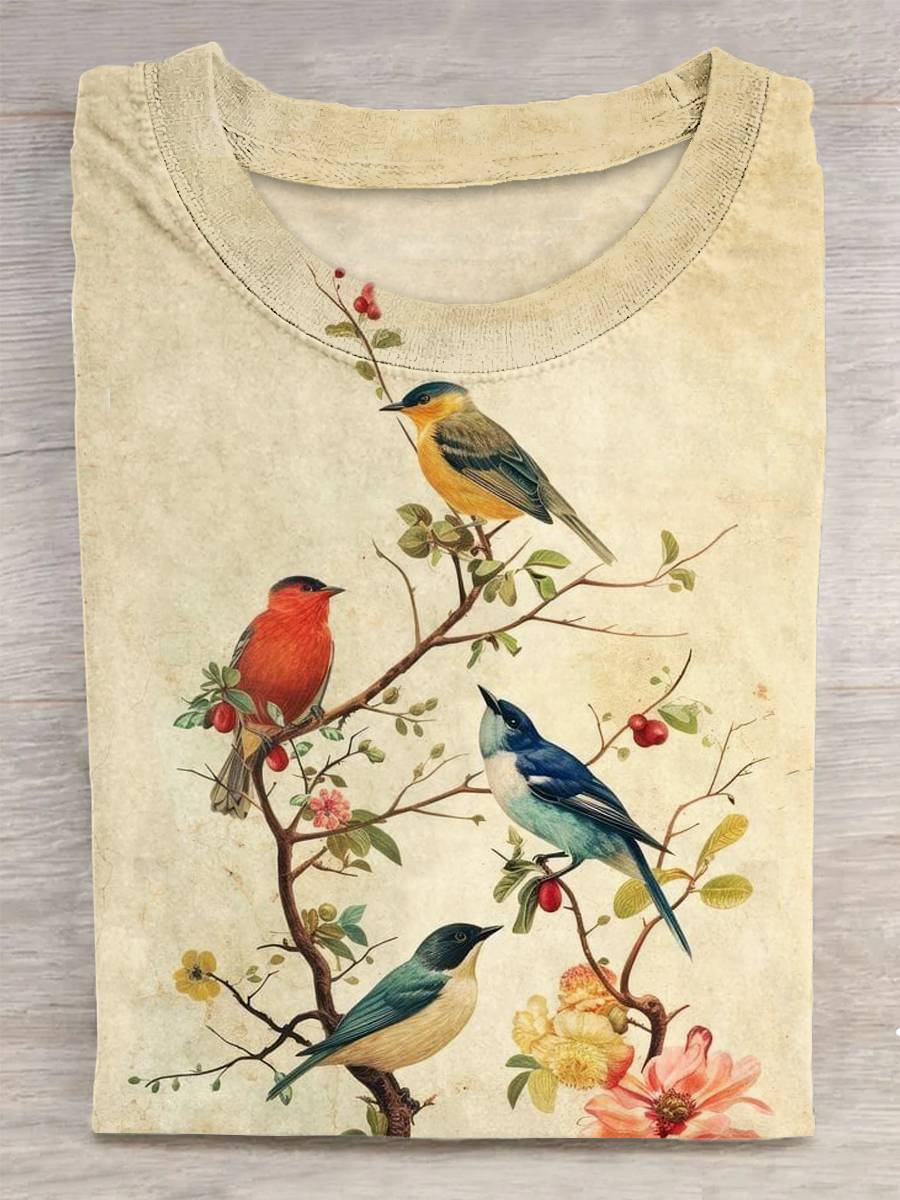 Flowers And Birds Printed Vintage Fashion Loose Short Sleeve T-Shirt