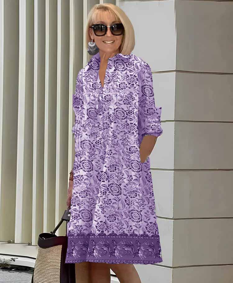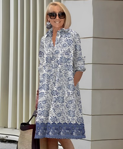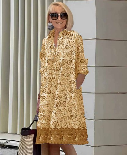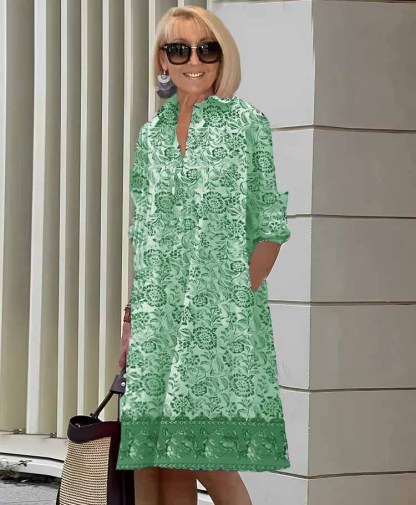 Flowers Print Mid-Length Long Sleeve Shirt Dress for Women Over 50