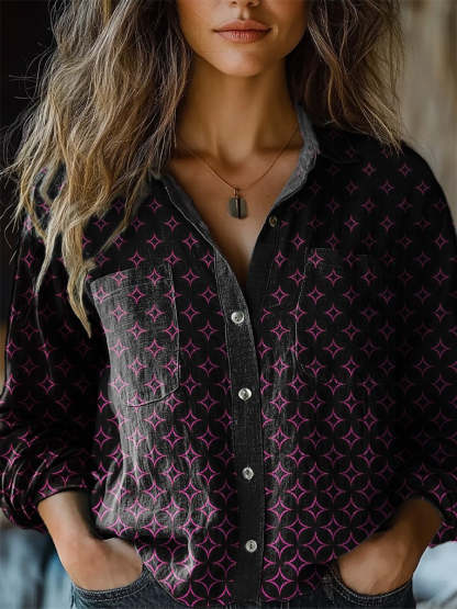 Geometric Star Pattern Printed Women's Casual Long Sleeve Comfortable Cotton Shirt