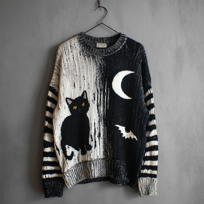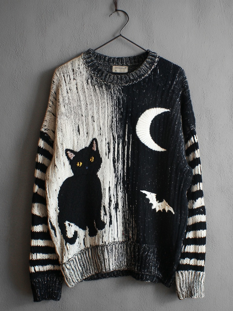 Halloween Black Cat & Bat Contrast Striped Sleeve Knitted Sweater