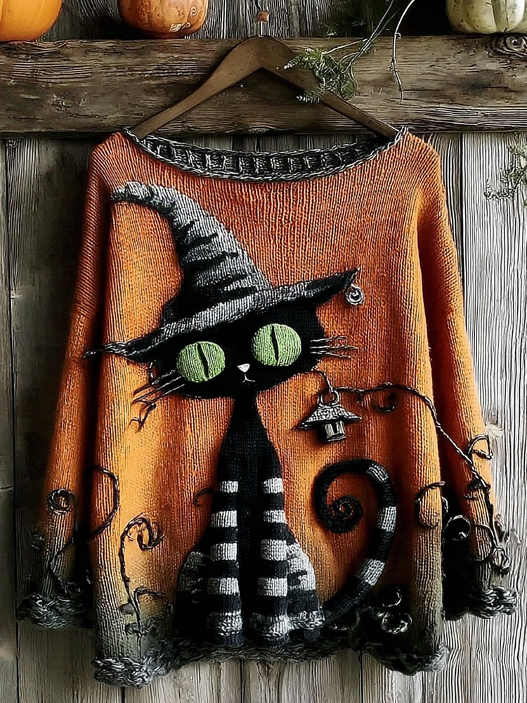 Halloween Black Cat Knitted Crew Neck Sweater