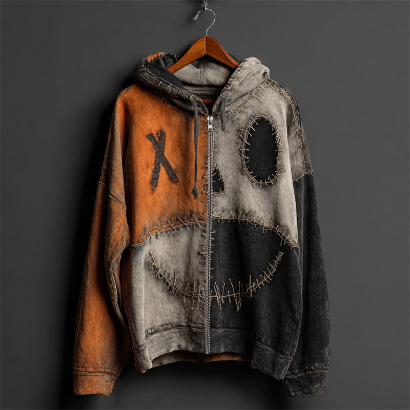 Halloween Pumpkin Face Colorblock Patchwork Full Zip Hoodie