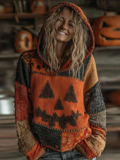 Halloween Pumpkin Face Patchwork Stitched Cozy Knit Hooded