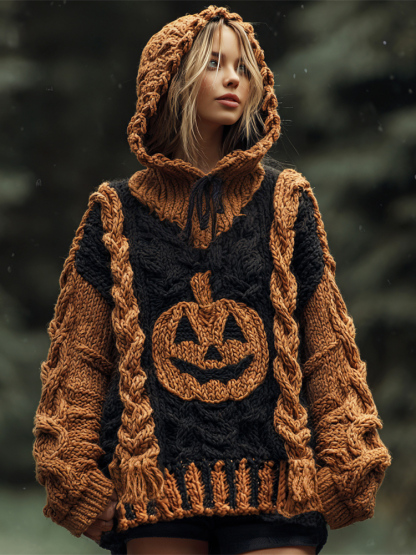Halloween Pumpkin Light Emoji Women's Chunky Knit Hooded Sweater