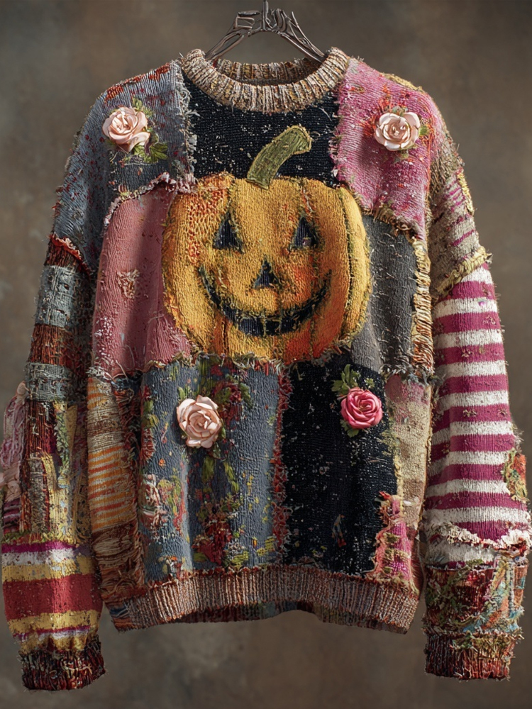 Halloween Pumpkin & Roses Embroidered Patchwork Knitted Sweater