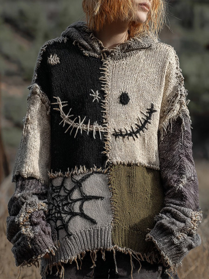 Halloween Spooky Face And Spider Web Patchwork Design Cozy Knit Hooded