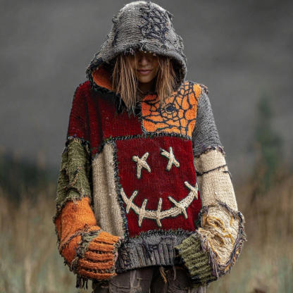 Halloween Spooky Face And Spider Web Patchwork Design Cozy Knit Hooded