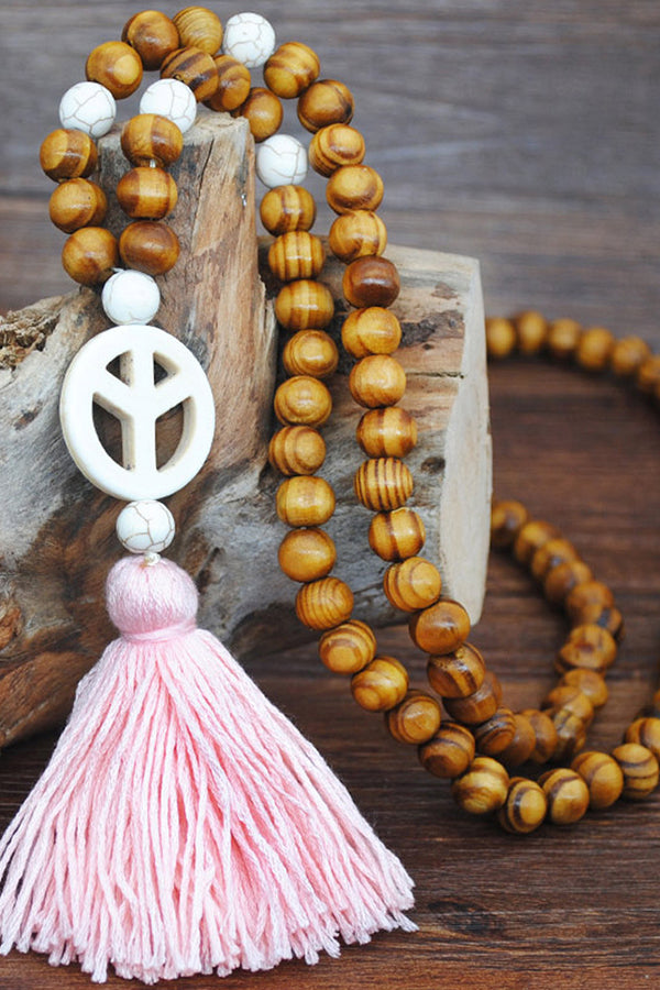 Handmade Wooden Beaded Tassel Sweater Chain - Pink Round Totem