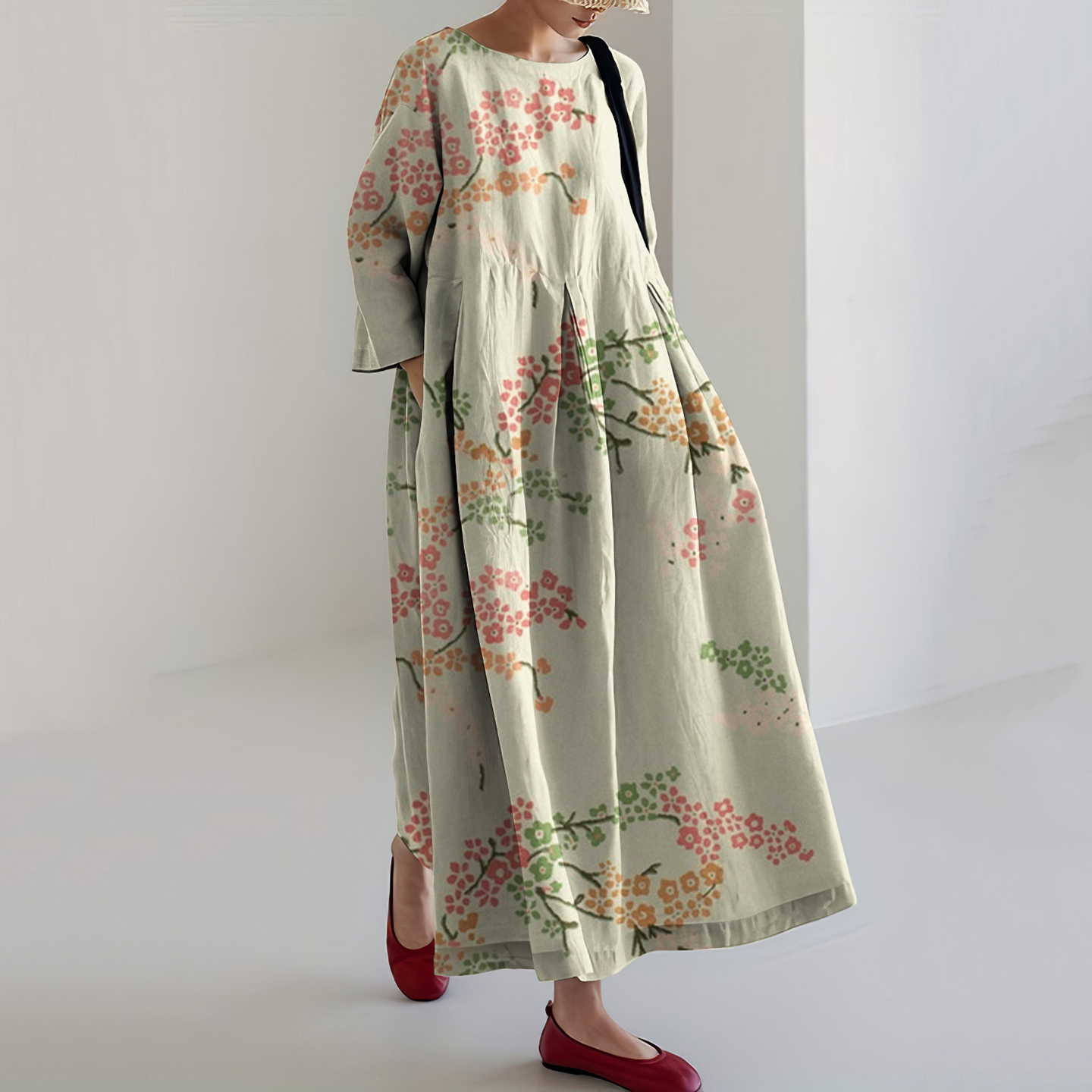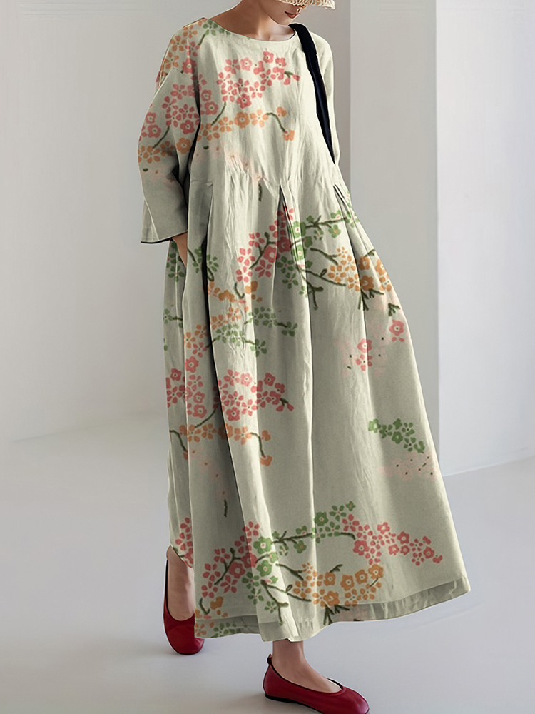 Japanese Art Flower Print Loose Casual Midi Dress
