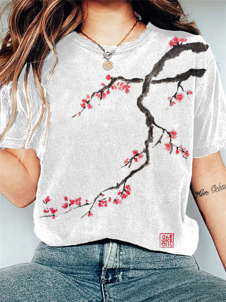 Japanese Art Ink Painting Flower Print Casual T-Shirt