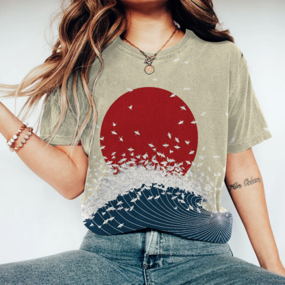 Japanese Art Print Round Neck Short Sleeve Casual T-Shirt
