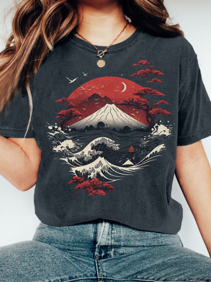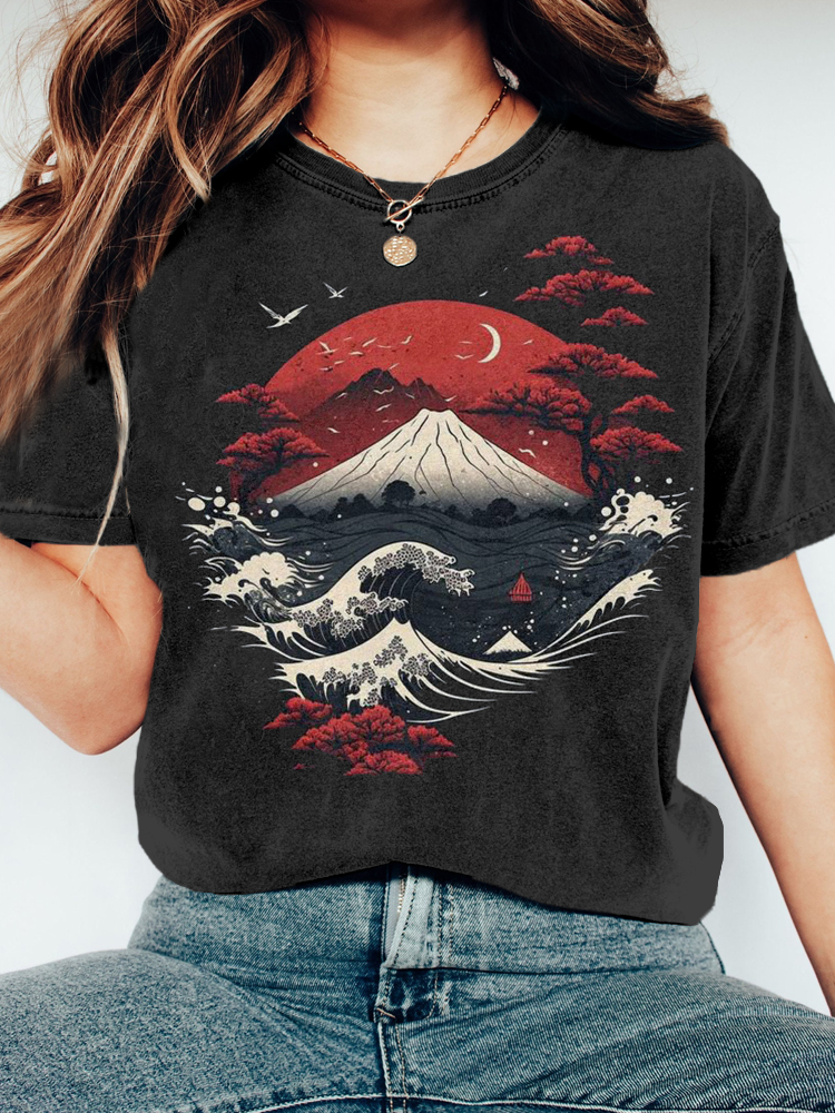 Japanese Great Wave Fuji Mountain Sunset Art Vintage T Shirt
