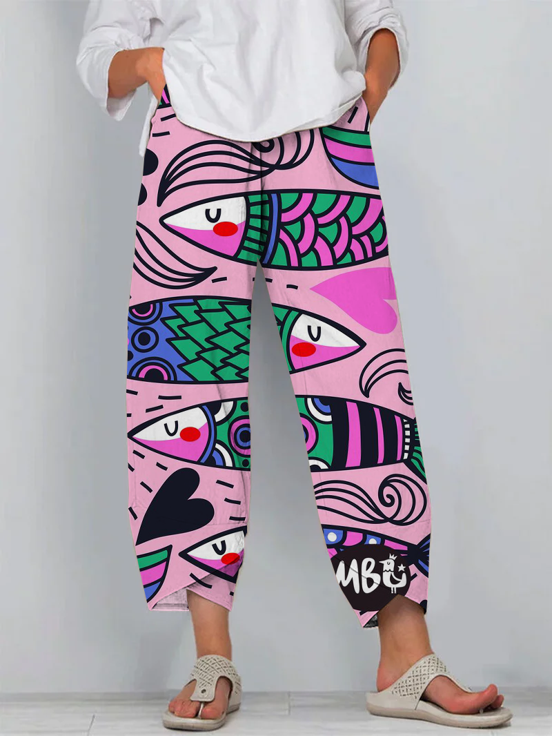 Japanese Pink Sardine Art Print Cropped Pants