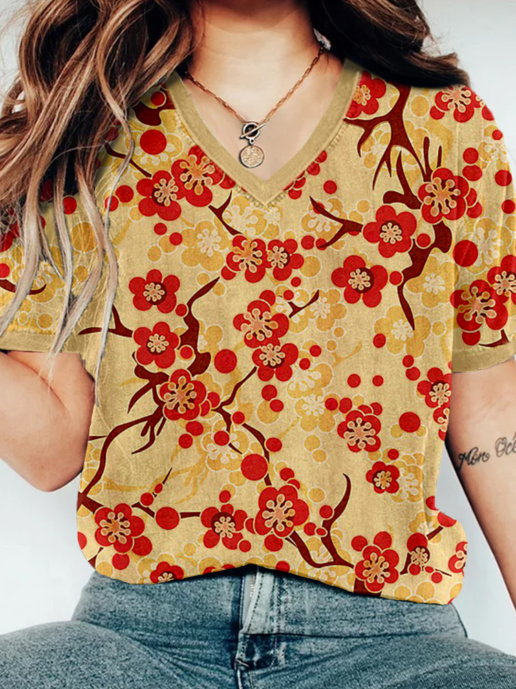 Japanese Plum Blossom Art Vintage V Neck T Shirt