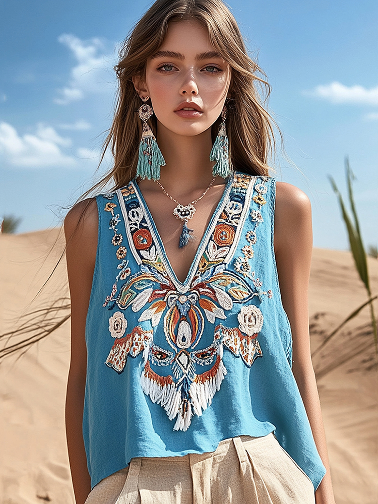 Women's Bohemia Floral Ethnic Art Linen V-neek Sleeveless Top