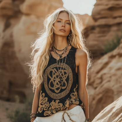 Women's Viking Tribal Ethnic With Celtic Knot Pattern Art Linen Sleeveless Top