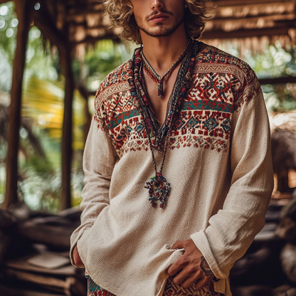 Men's Bohemian Holiday Style Vintage Linen Printed Casual Long Sleeve Top
