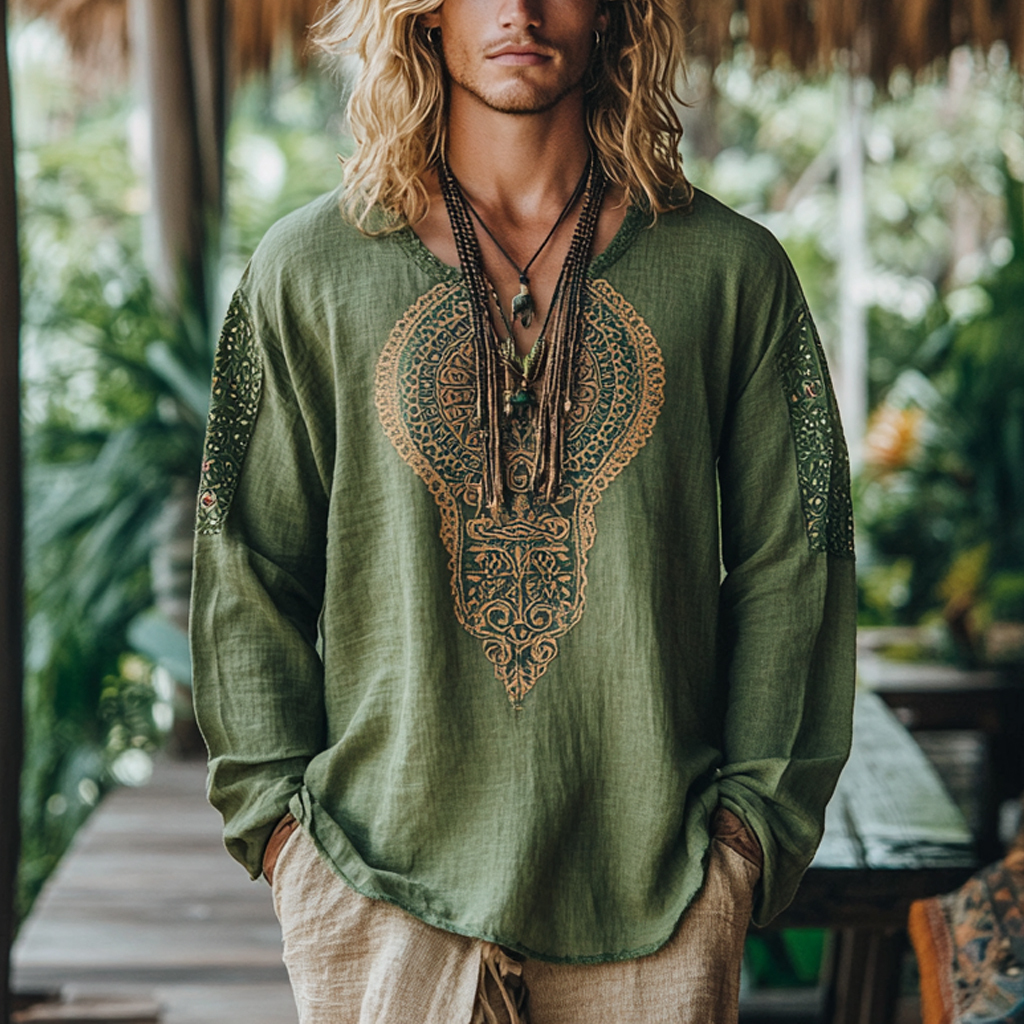Men's Bohemian Holiday Style Vintage Linen Printed Casual Long Sleeve Top