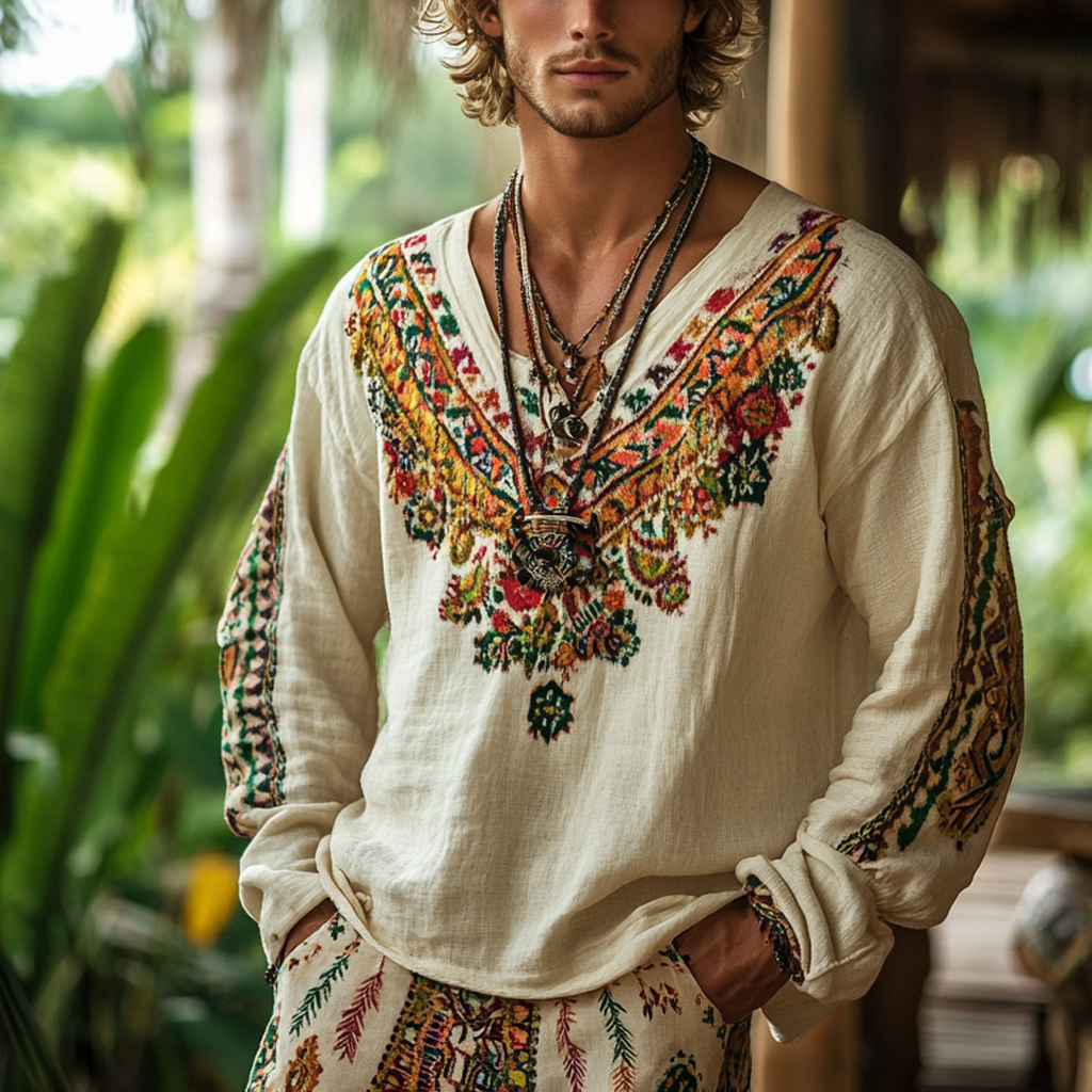 Men's Bohemian Holiday Style Vintage Linen Printed Casual Long Sleeve Top