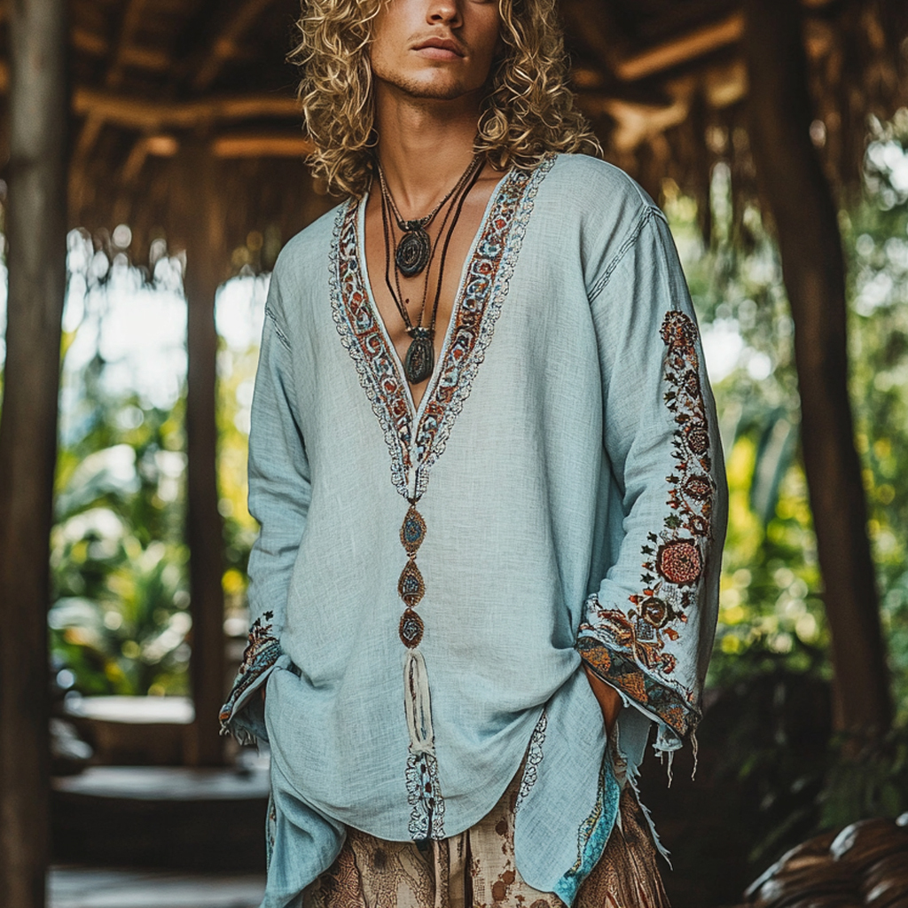 Men's Bohemian Holiday Style Vintage Linen Printed Casual Long Sleeve Top