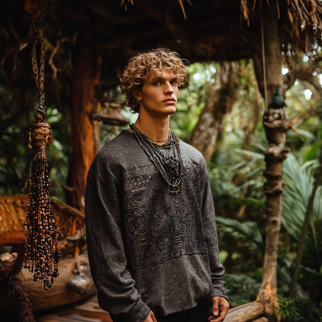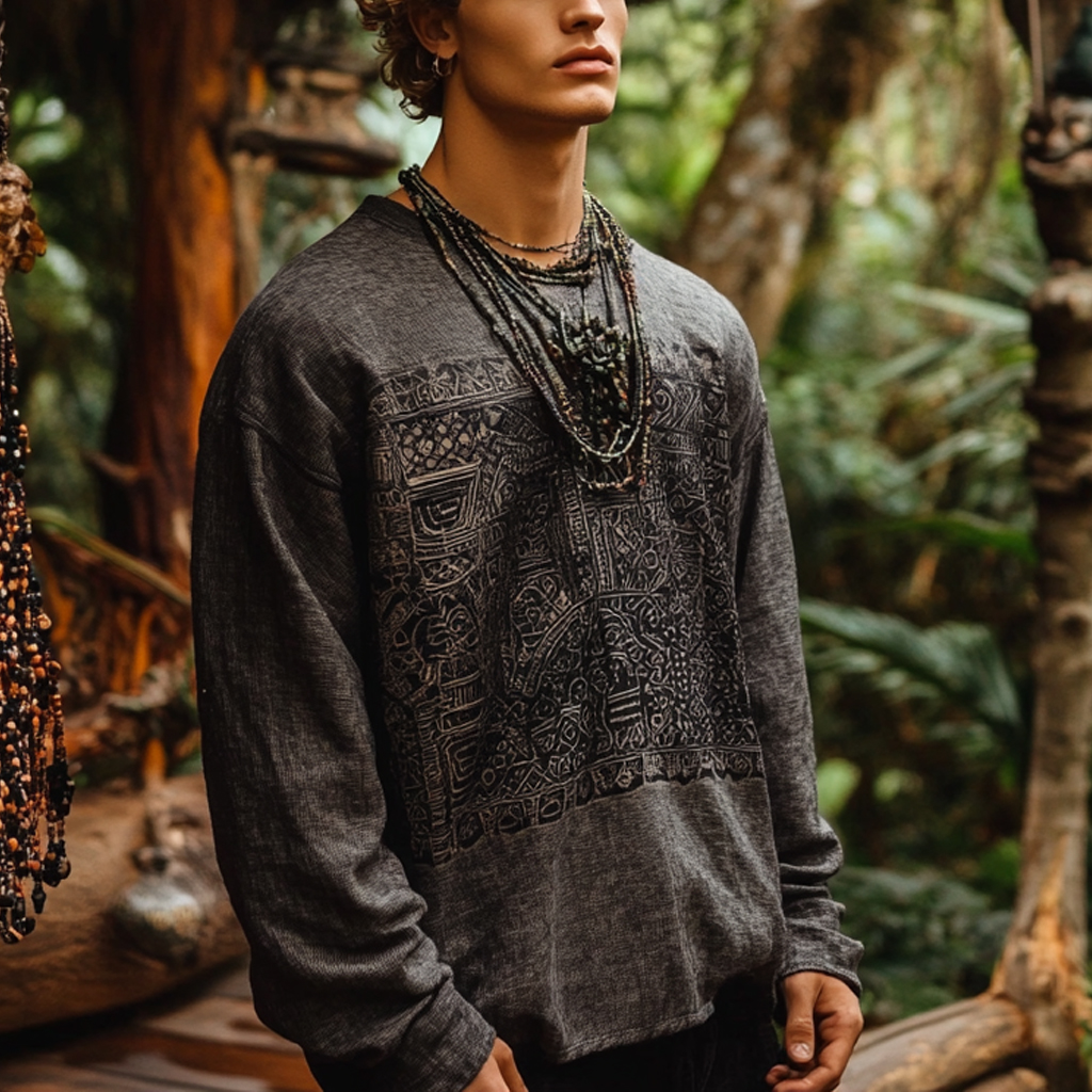 Men's Bohemian Holiday Style Vintage Linen Printed Casual Long Sleeve Top