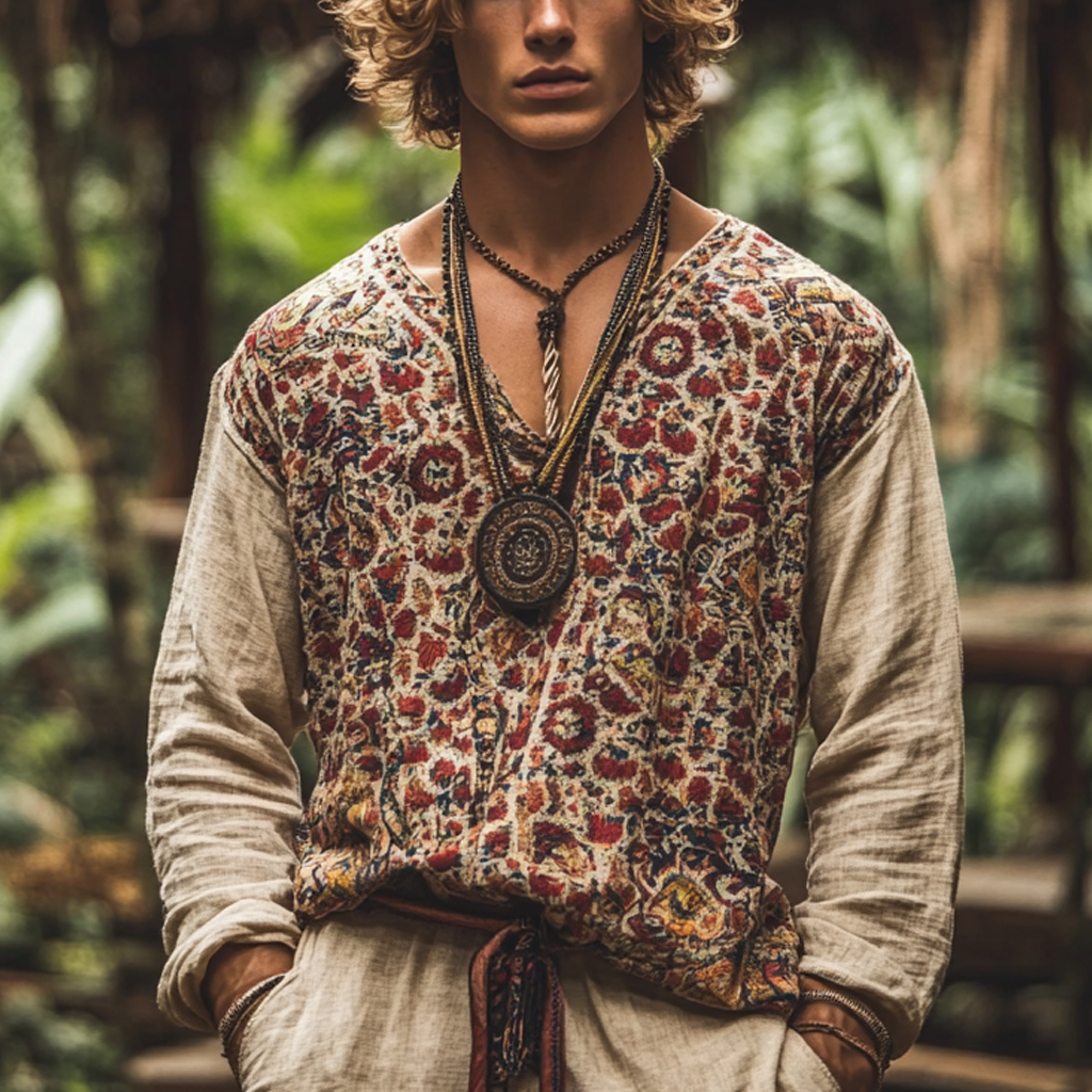 Men's Bohemian Holiday Style Vintage Linen Printed Casual Long Sleeve Top