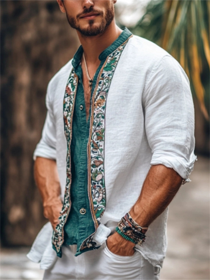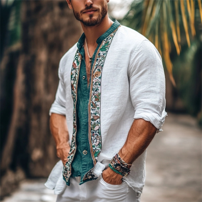 Men's Boho Floral Embroidered Hem Linen Blend Shirt
